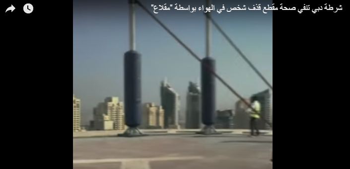 نفى مصدر أمني مسؤول، في القيادة العامة لشرطة دبي، صحة الفيديو المتداول لعملية قذف شخص في الهواء بواسطة آلة دافعة (مقلاع) من على سطح برج في مارينا دبي إلى برج آخر، ووفاة الشخص بعد سقوطه بعيدًا عن الهدف المحدد.