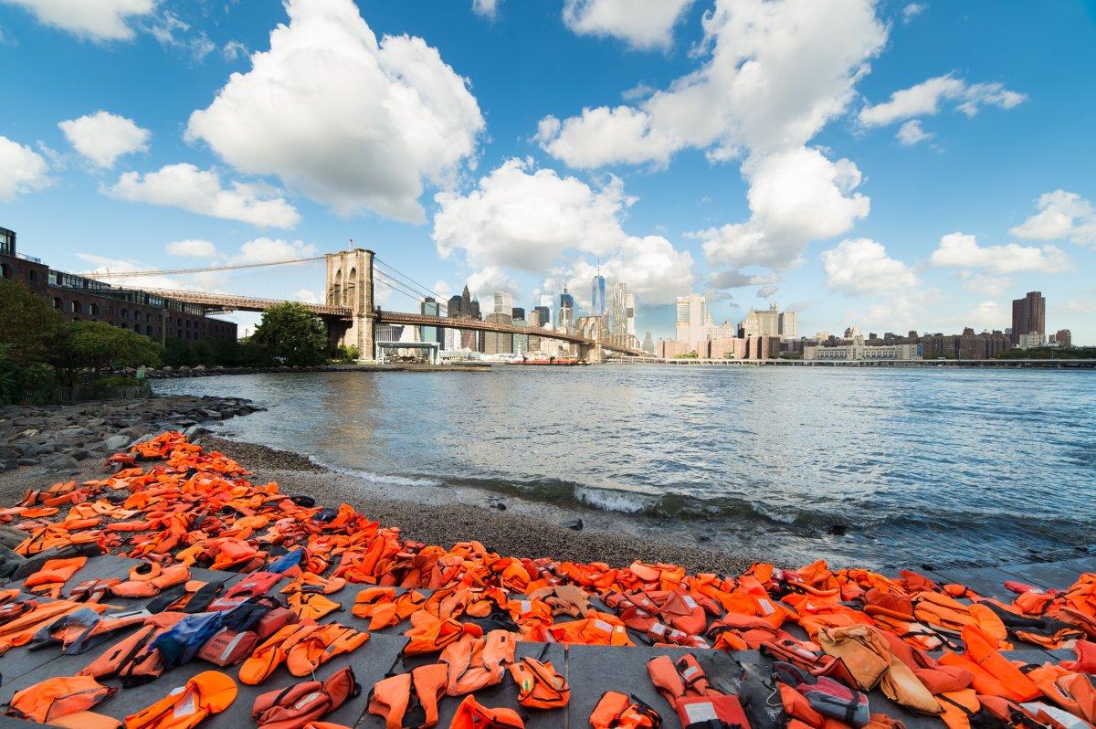 عرضت منظمة "أوكسفام أمريكا" يوم الجمعة الماضي على شاطئ نيويورك بجوار جسر بروكلين مئات من سترات النجاة البرتقالية التي استعملها اللاجئون خلال رحلتهم إلى اليونان قبل بداية قمة الأمم المتحدة للاجئين والمهاجرين.