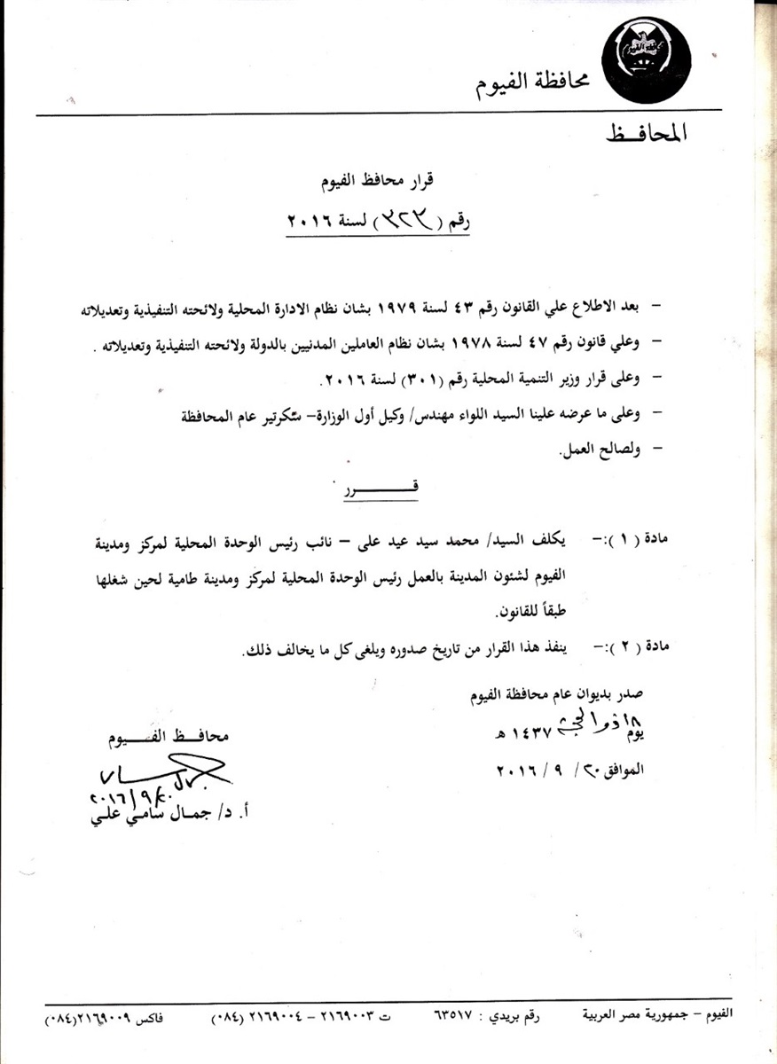 محافظ الفيوم يكلف محمد سيد عيد رئيسا لمركز ومدينة طامية