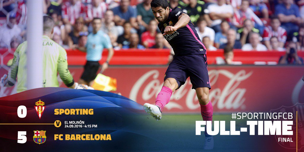 انهي نادي برشلونة الاسباني مباراته مع نادي سبورتنج خيخون بفوز عريض بخماسية نظيفه علي ملعب المولينون ضمن منافسات الاسبوع السادس من عمر مسابقة الدوري الاسباني"الليجا".