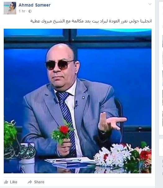 وبدأ رواد مواقع التواصل يتداولون بعض الكوميكس الساخرة كعادتهم ولكن كان من أشهرها هي عودة أنجلينا جولي لبراد بيت بعد مكالمة الشيخ مبروك عطية لها وأعطاها فتوى حول المشاكل الزوجية.