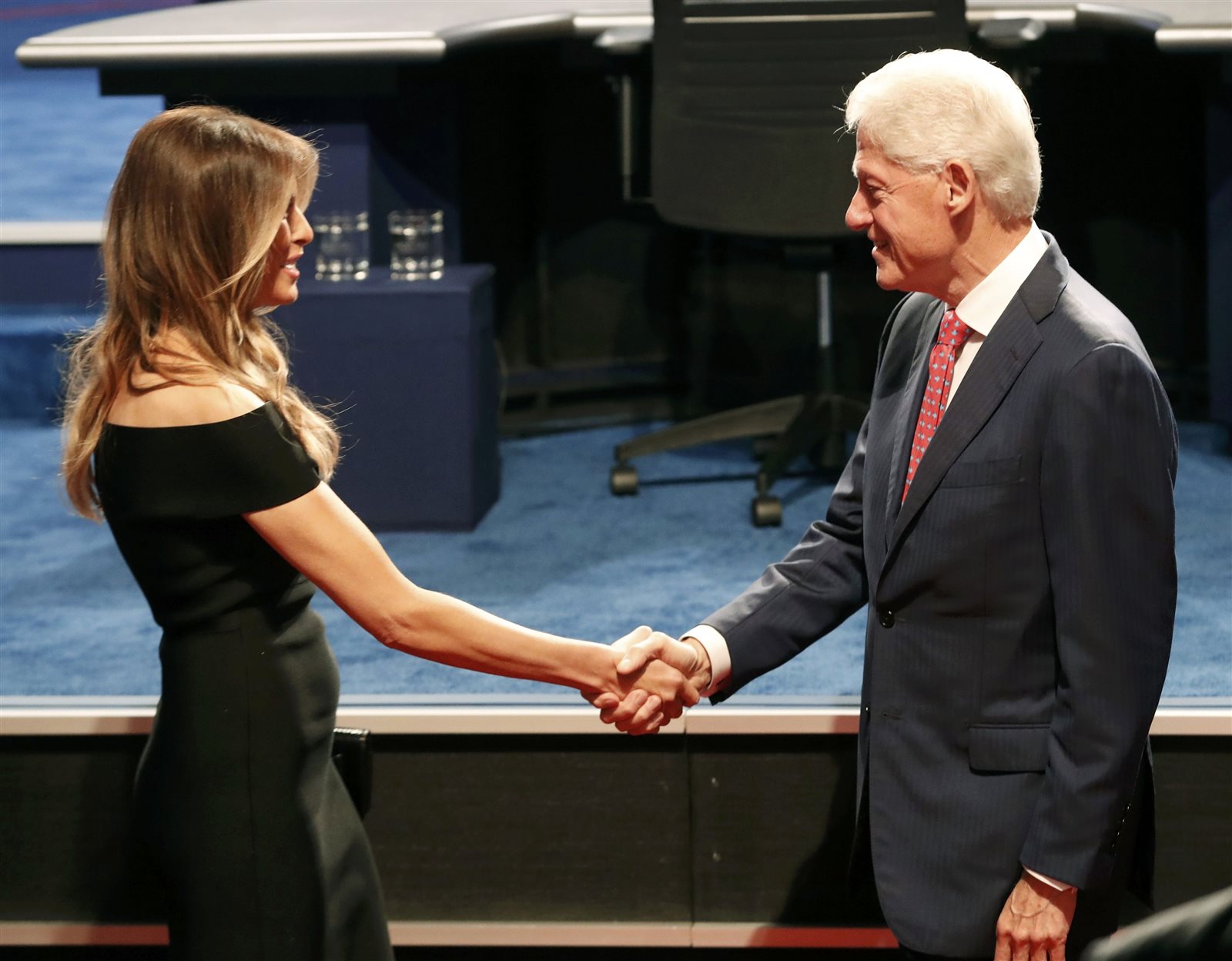 ظهر الرئيس الأمريكي الأسبق بيل كلينتون داخل قاعة المناظرة بين هيلاري كلينتون ودونالد ترام بالمرشحان الرئاسيان في أول مناظرة بينهما داخل جامعة هوفسترا.