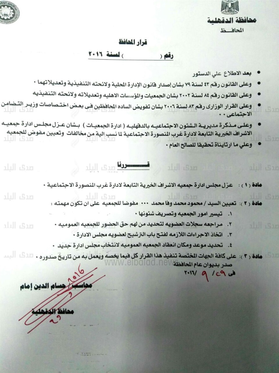 كما شمل القرار تعيين محمود وفا مفوضا للجمعية على أن تكون مهامه تسيير أمور الجمعية وتصريف شئونها ومراجعة سجلات العضوية لتحديد من لهم الحق فى الحضور للجمعية العمومية.