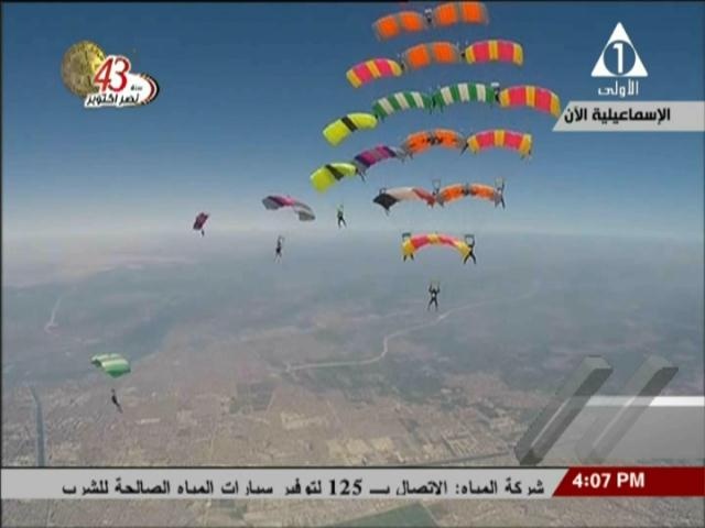 قدَّم جنود المظلات من القوات المسلحة عرضًا يشكل أعلام الدول العربية الشقيقة التى شاركت فى حرب أكتوبر العظيمة 1973، وذلك خلال احتفالات القوات المسلحة بالذكرى الـ43 لنصر أكتوبر المجيد، حيث غطى التشكيل سماء الإسماعيلية.