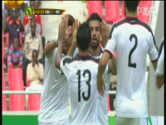 احرز محمد صلاح هدف التعادل فى الدقيقة 35 اثر تلقيه تمريرة سحرية من محمد عبدالشافى ليسددها برأسه وتسكن شباك الحارس الكونغولى.