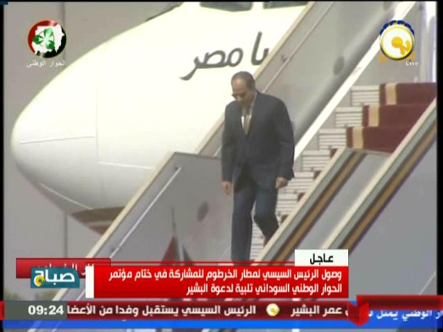 وصل الرئيس السيسي لمطار الخرطوم اليوم الاثنين، للمشاركة في ختام أعمال مؤتمر الحوار الوطنى السوداني في الخرطوم، وذلك تلبية للدعوة الموجهة له من الرئيس عمر البشير.