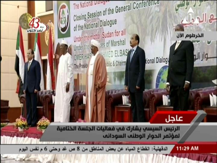 وصرح السفير علاء يوسف المتحدث الرسمي باسم رئاسة الجمهورية بأن مشاركة الرئيس عبد الفتاح السيسي في الجلسة الختامية لمؤتمر الحوار الوطني السوداني تأتي فى إطار العلاقة الخاصة التي تربط بين البلدين والشعبين الشقيقين، وما يجمعهما من تاريخ ممتد ومصير مشترك.
