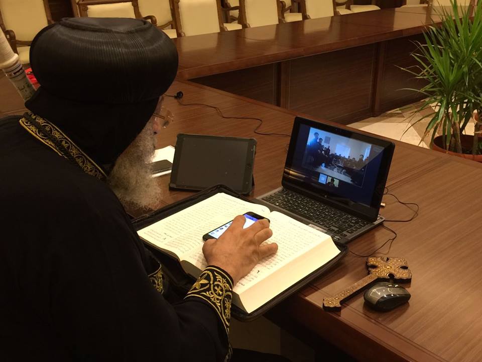 وتواصل قداسة البابا مع أبنائه عبر شبكة الانترنت من خلال video confrance لمدة ساعة ونصف والقي قداسته محاضرة بعنوان: "اجتهد واحذر" وبعد اللقاء قدم قداسته شرح مفصل عن قانون بناء الكنائس الجديد رقم 80 لسنة 2016. وكذلك أهمية زيارة الأردن.