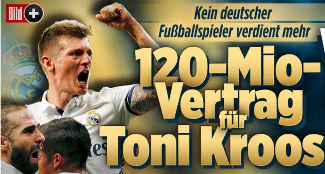 تجديد عقد ريال مدريد من شأنه أن يجعل كروس اللاعب الالماني الأعلى أجرا في كل العصور ومع عقده الحالي هو الرابع وراء مولر (15 مليون في بايرن ميونيخ ) ، وشفاينشتايجر (14 مليون في مانشستر يونايتد )، وجوندوجان (12 مليون في مانشستر سيتي).