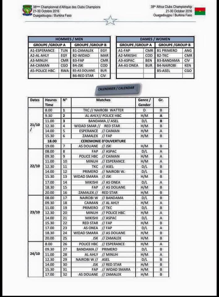 يذكر أن البطولة ستقام في بوركينا فاسو من يوم 21 الي 30 اكتوبر الجاري.