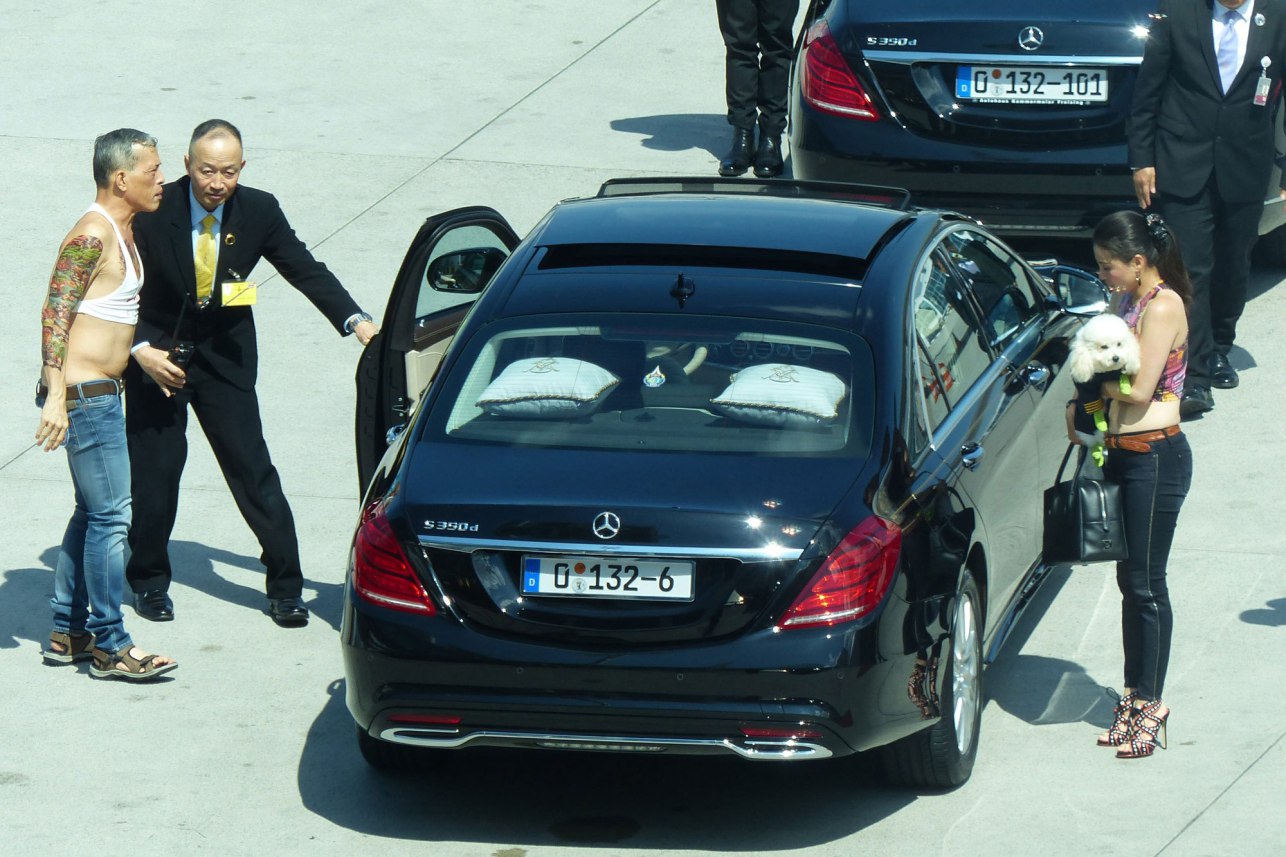 وقالت التقارير في حينه إنه توجه لألمانيا على متن طائرة من طراز بوينغ 737 مرتديا الجينز وحاملة الصدر، وترافقه زوجته الثالثة التي كانت أيضًا ترتدي الجينز الضيق، بالإضافة إلى وجود 30 من حراس الأمن.
