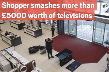 وبعدما وجد ما يبحث عنه حاول تشغيله، ولكن الكارثة أنه دفع التلفاز للأمام ليسقط ومعه التلفزيون المقابل له، ومن صدمته حاول الرجوع للخلف، فحطم اثنين آخرين، بمجموع 4 أجهزة فى النهاية تحطمت بقيمة 5000 جنيه إسترليني.
