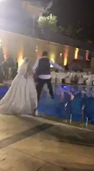 وأظهر الفيديو، الذي تم التقاطه بالعاصمة اللبنانية "بيروت"، العروسين وهما يقفان أمام حمام سباحة ويحيط بهما المدعون، وبعد ذلك قفز الزوجان في حمام السباحة، وسط هتاف وتصفيق الحاضرين، لكن فجأة حدث أمر غير متوقعا، حيث أن العروس كادت تغرق في المياه، بعد أن أعاق فستان الزفاف قدرتها على السباحة.