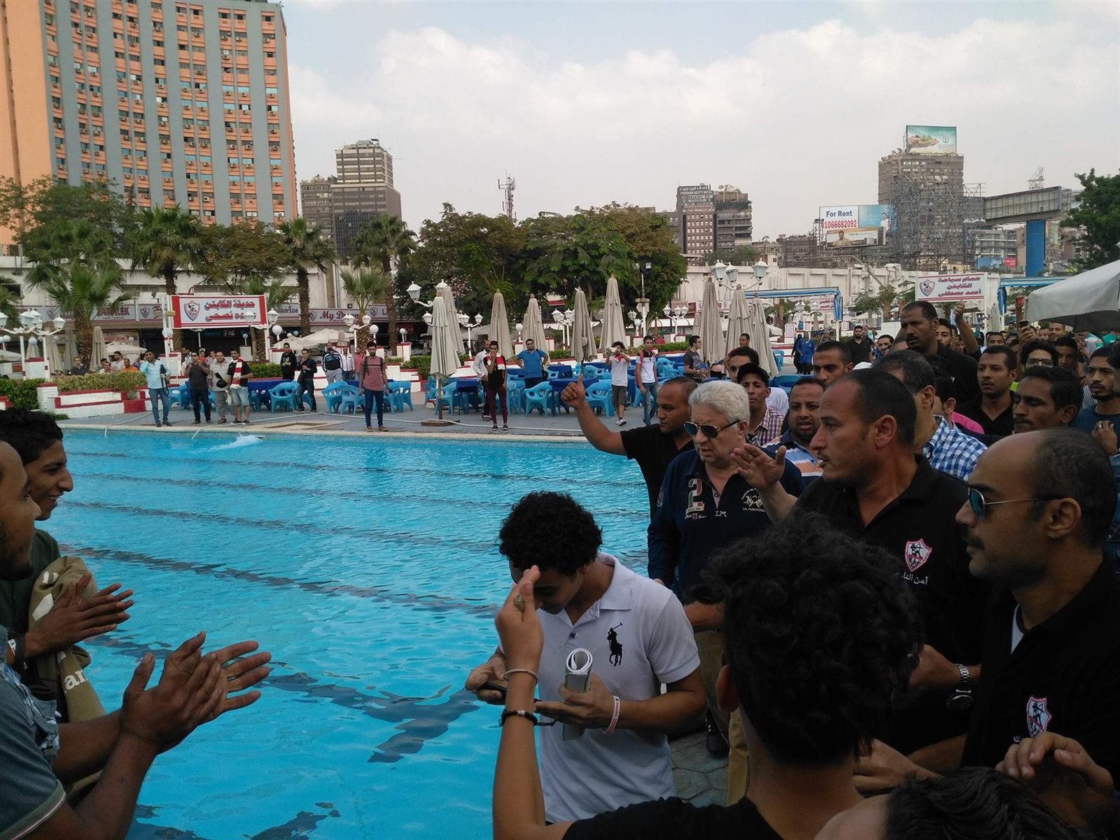 تجمهر عدد من جماهير الزمالك الراغبة فى شراء تذاكر مباراة الفريق أمام صن داونز الجنوب إفريقى المقرر إقامتها الأحد المقبل بالإسكندرية فى إياب نهائى دورى ابطال افريقيا لكرة القدم حول رئيس النادى المستشار مرتضى منصور أمام حمام السباحة داخل القلعة البيضاء.