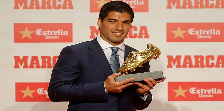 تسلم الأوروجوياني لويس سواريز، اليوم الخميس جائزة الحذاء الذهبي كأفضل هداف في الدوريات الأوروبية الموسم الماضي.