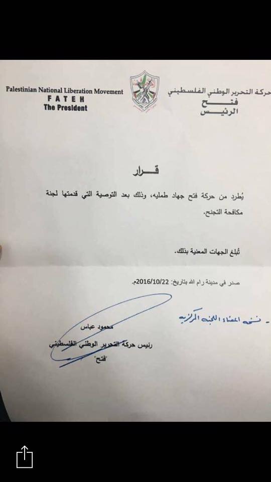 ذكرت وسائل إعلام فلسطينية، امس السبت، أن الرئيس الفلسطيني، محمود عباس "أبومازن" أصدر قرارا بفصل النائب عن حركة فتح، جهاد طملية، بسبب اتهامه بـ"التجنح".