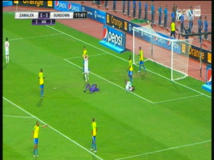 وسقط حارس مرمى صن داونز داخل منطقة الجزاء إثر احتكاك باسم مرسي بالحارس فى الدقيقة الرابعة ما أدى الى احتساب الحكم ركلة حرة لصالح المنافس ورفض حكم اللقاء الانصياع الى طلبات لاعبي الفريق الجنوب افريقي بطرد مهاجم الزمالك.