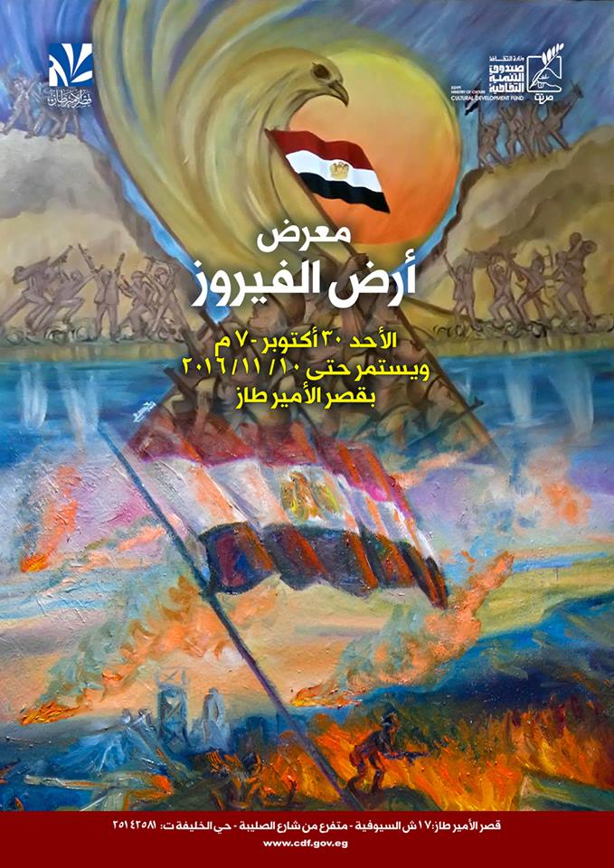 يقام معرض "أرض الفيروز" بقصر الأمير طاز، والتابع لقطاع صندوق التنمية الثقافية برئاسة الدكتورة نيفين الكيلاني، وذلك في السابعة من مساء الأحد 30 أكتوبر، وذلك في إطار الاحتفالات بالذكرى الـ 43 لحرب أكتوبر.