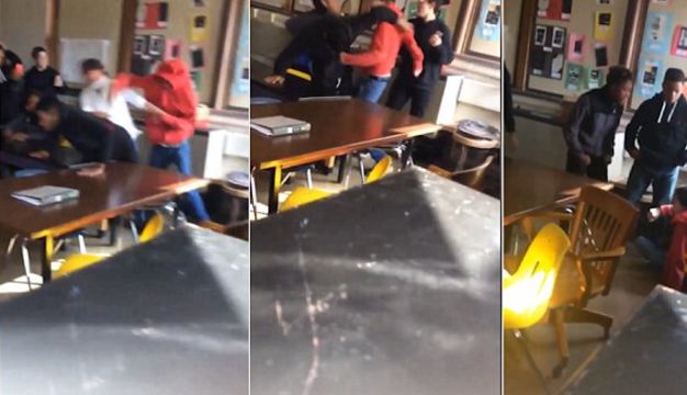 ليتحول الفصل الدراسي إلى ساحة للعراك ويشترك فيها العديد من التلاميذ بأحد مدارس الولايات المتحدة الأمريكية، ولاقى الفيديو رواجًا كبيرًا على مواقع التواصل الاجتماعى فور نشره، وتسبب فى حالة سخط ضخمة بين الرواد.