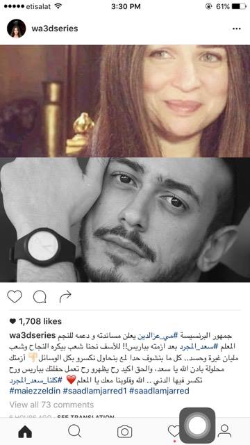 وعلق علي الصورة " جمهور البرنسيسة مي عز الدين يعلن مساندته ودعمه للنجم المعلم سعد لمجرد بعد أزمته بباريس للأسف نحن نكره النجاح كل ما بنشوف حد ناجح بنحاول نكسره كلنا معاك يا سعد".