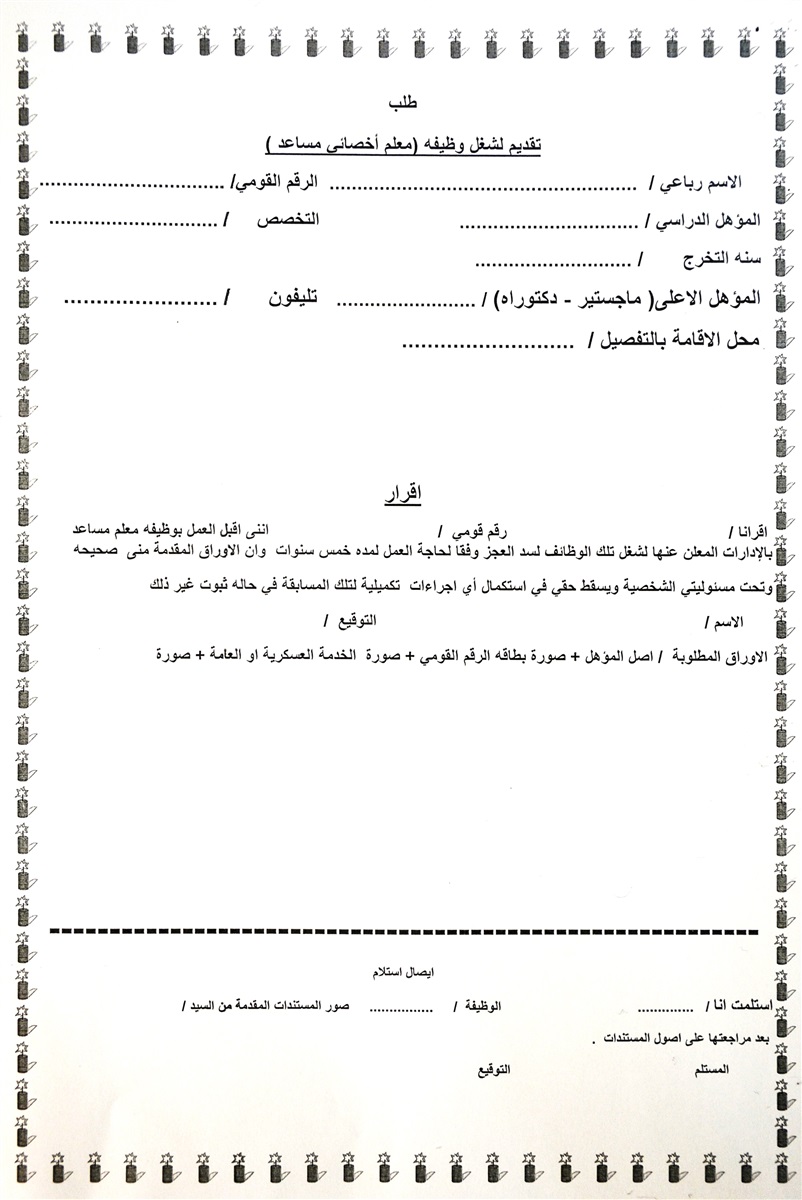 والأوراق المطلوبة هي " أصل المؤهل + صورة بطاقة الرقم القومي + صورة الخدمة العسكرية أو العامة + صورة شخصية".