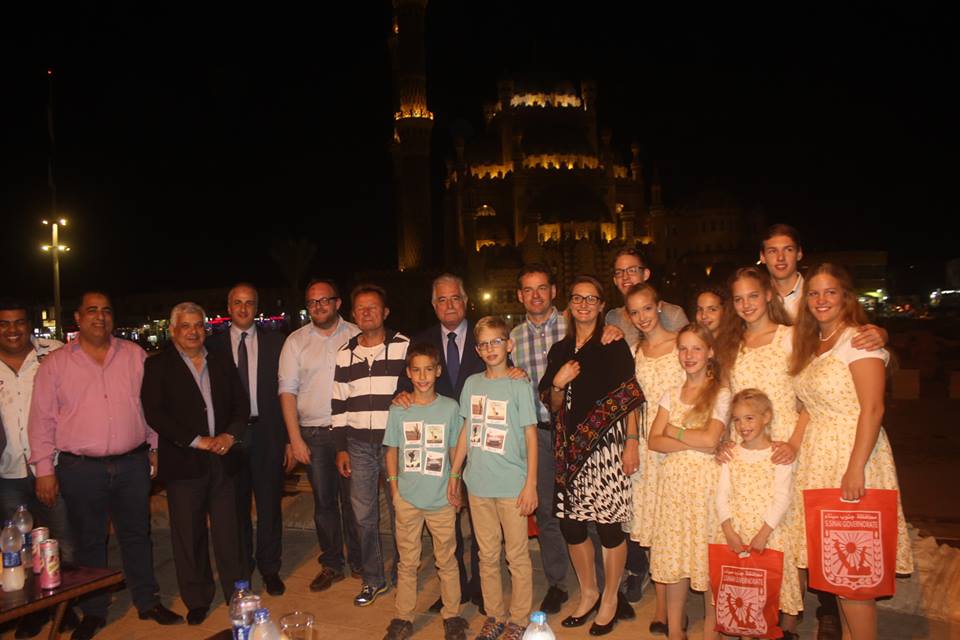 استضاف اللوء خالد فودة محافظ جنوب سيناء مساء امس، الجمعة، أسرة نمساوية عاشقة لمدينة شرم الشيخ وتتابع أخبارها بصورة مستمرة، وذلك على مائدة عشاء بسيطة على أنغام المزمار البلدى وبعض الفنون الشعبية بميدان مسجد الصحابة بالسوق التجارى القديم.
