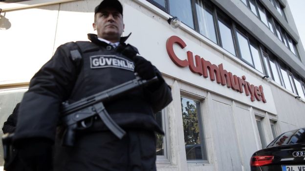 وقالت الصحيفة في افتتاحية وصفت الاعتقالات بأنها بداية محاولة لغلقها "حتى إذا اعتقل مديرو جمهوريت وكتابها فستستمر صحيفتنا في كفاحها من أجل الديمقراطية والحرية حتى النهاية."