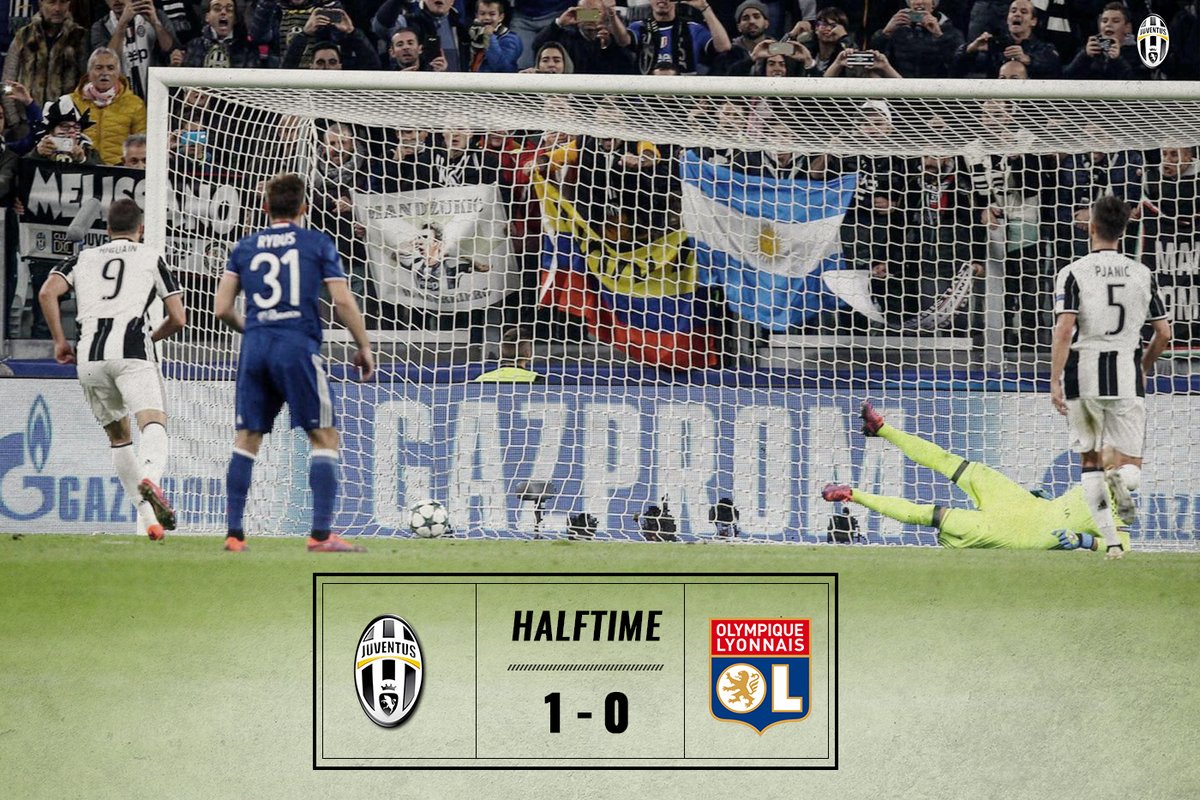 حسم فريق يوفنتوس الايطالى الشوط الاول لصالحه على حساب ضيفه ليون الفرنسي بهدف دون رد بالمواجهة التى تقام على ملعب يوفنتوس ارينا بدور المجموعات لبطولة دورى الابطال الاوروبي.