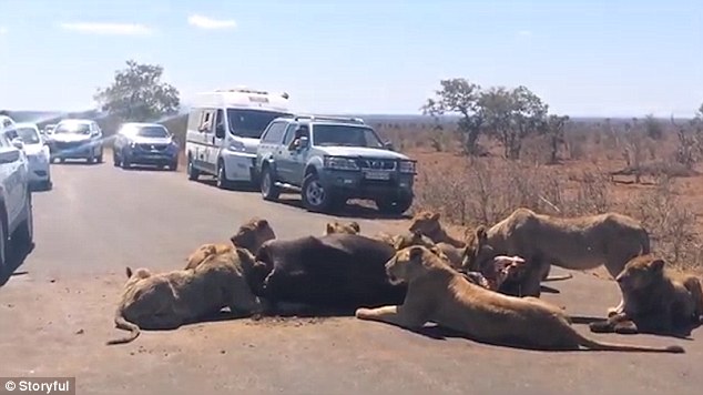 وفي الفيديو الذي نشرته صحيفة ديلى ميل البريطانية ظهرت مجموعة من الأسود يلتفون حول جاموس بري، بعد أن تم اصطياده وتسبب ذلك في عطل مروري استمر لمدة 6 ساعات حتى انتهوا من طعام الفريسة.