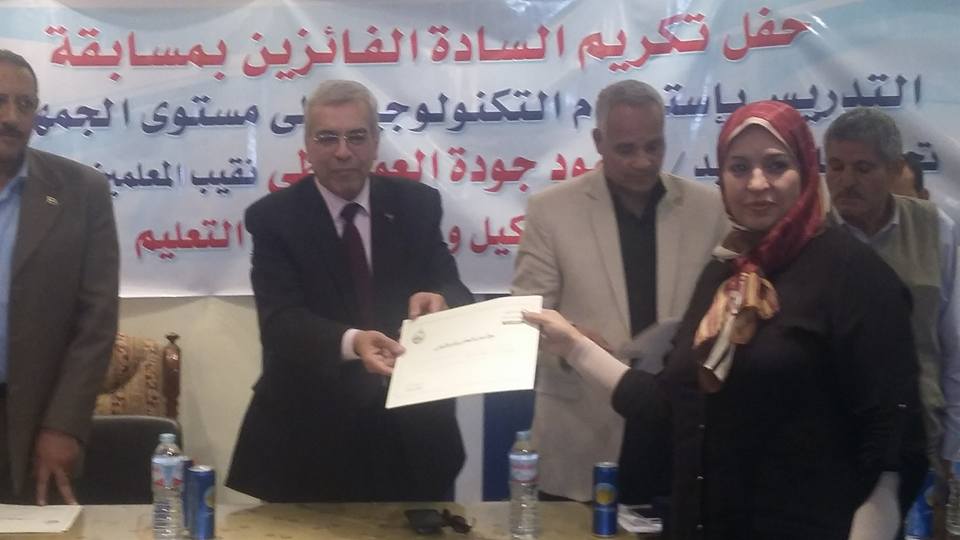 وسلم طه عجلان وكيل وزارة التعليم يرافقه محمود العمريطى شهادات التقدير ودروع النقابة لمدير المركز ومسئولى وحدة الدمج التكنولوجى والمعلمين المبدعين.