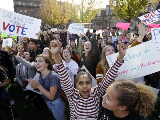 ورصدت صحيفة «يو إس إيه توداي» في تقرير نشرته اليوم الثلاثاء، المئات من المراهقين، ممن لم ترق أعمارهم حتى بما يكفي للتصويت، قد خرجوا من الفصول الدراسية على الساحلين الشرقي والغربي، و حملوا علامات، ورددوا شعارات ضد رجل أمريكا الأول والذي يقولون أنه يشكل خطرا على مستقبلهم.
