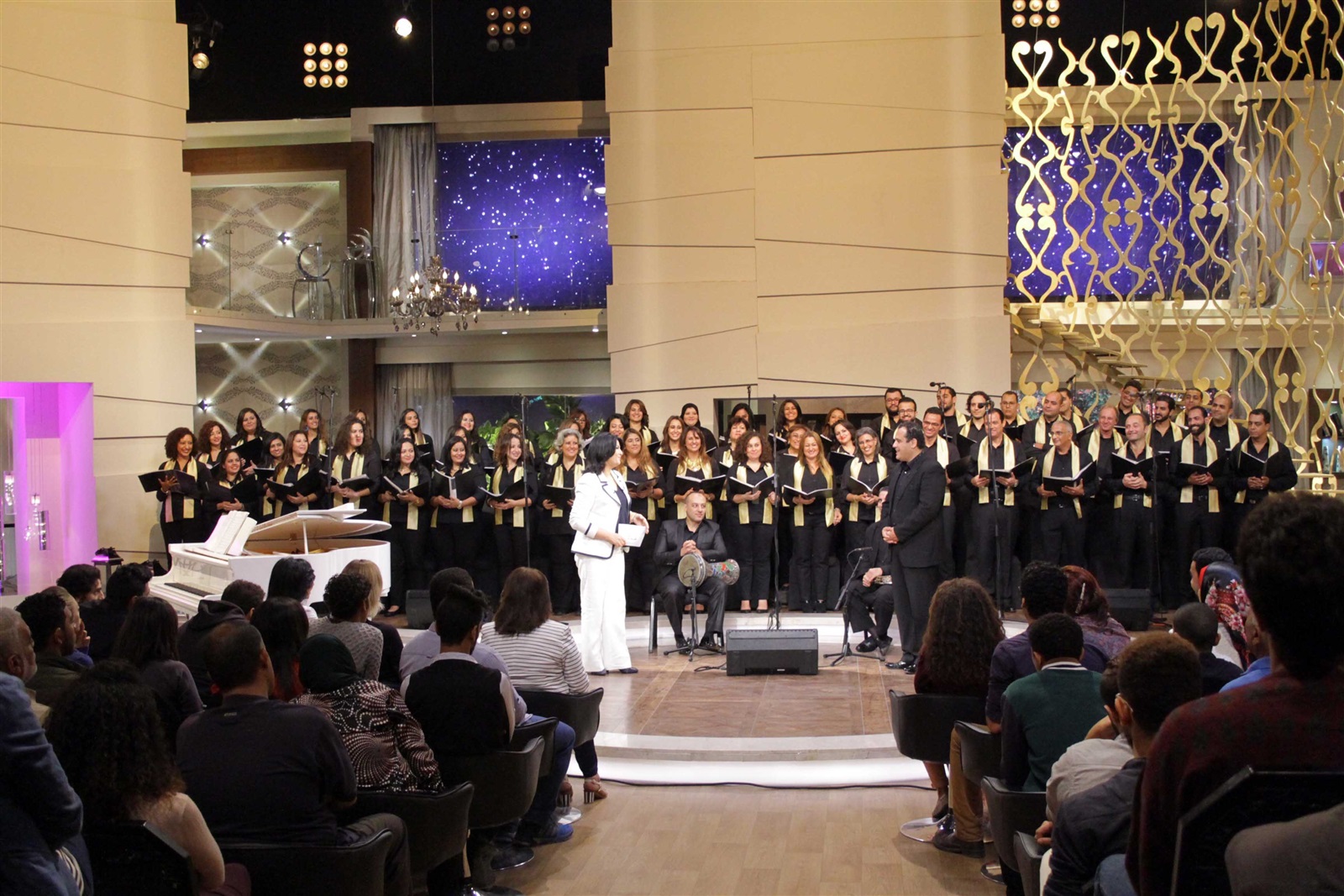 وقدم الكورال الذي حضر لاستوديو البرنامج كاملا بزيه المميز عددا من الأغنيات الشهيرة منها "يا بلح زغلول" و"أهو ده اللي صار" والنشيد القومي بلادي بلادي.