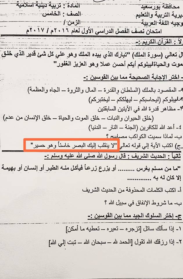 كانت سادت حالة من الاستياء بين أولياء أمور طلاب الصف الخامس الابتدائي، بسبب خطأ في "آية قرآنية" بامتحان "الميد تيرم" للتربية الدينية تداولها نشطاء علي موقع التواصل الاجتماعي "فيس بوك".