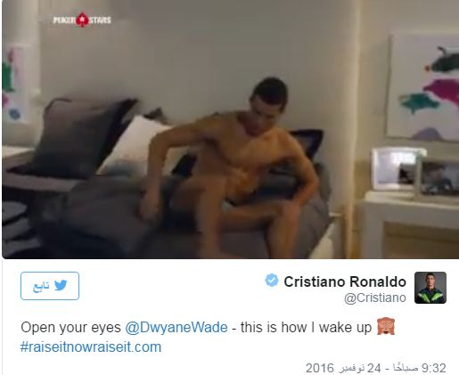 تداول عدد من رواد مواقع التواصل الاجتماعي مقطع فيديو تداوله النجم البرتغالي كريستيانو رونالدو، لاعب ريال مدريد الاسباني، على صفحته على موقع تويتر.Open your eyes @DwyaneWade - this is how I wake up 🙈 #raiseithttps://t.co/i6J4wmrc1W pic.twitter.com/QIAujMQnW6