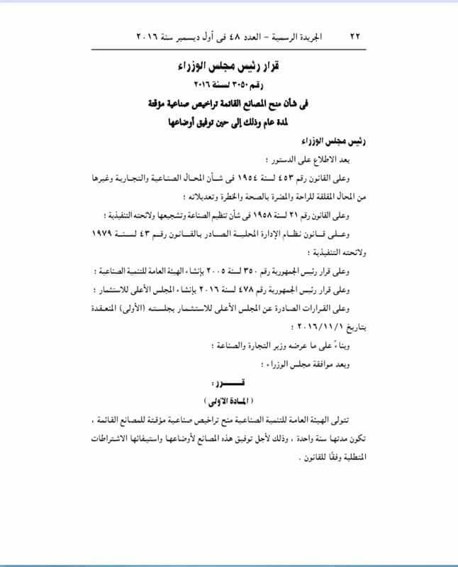 أصدر المهندس شريف إسماعيل، رئيس الوزراء القرار رقم 3050 لسنة 2016 بمنح تراخيص مؤقتة للمصانع القائمة
