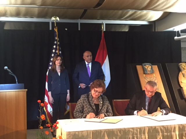 واختتم ابو زيد تصريحاته مشيرا الي ان وزير الخارجية استهل زيارته الي واشنطن بالتوقيع على مذكرة تفاهم مع نظيره الامريكي فى مجال حماية الاثار من التهريب، والتى تعد أول اتفاقية توقع عليها الولايات المتحدة مع دولة شرق أوسطية فى هذا المجال، والتي تضع قواعد وقيود والتزامات لمنع الاتجار غير الشرعى فى الأثار ومواجهة ظاهرة تهريب الاثار المصرية داخل الولايات المتحدة الامريكية.