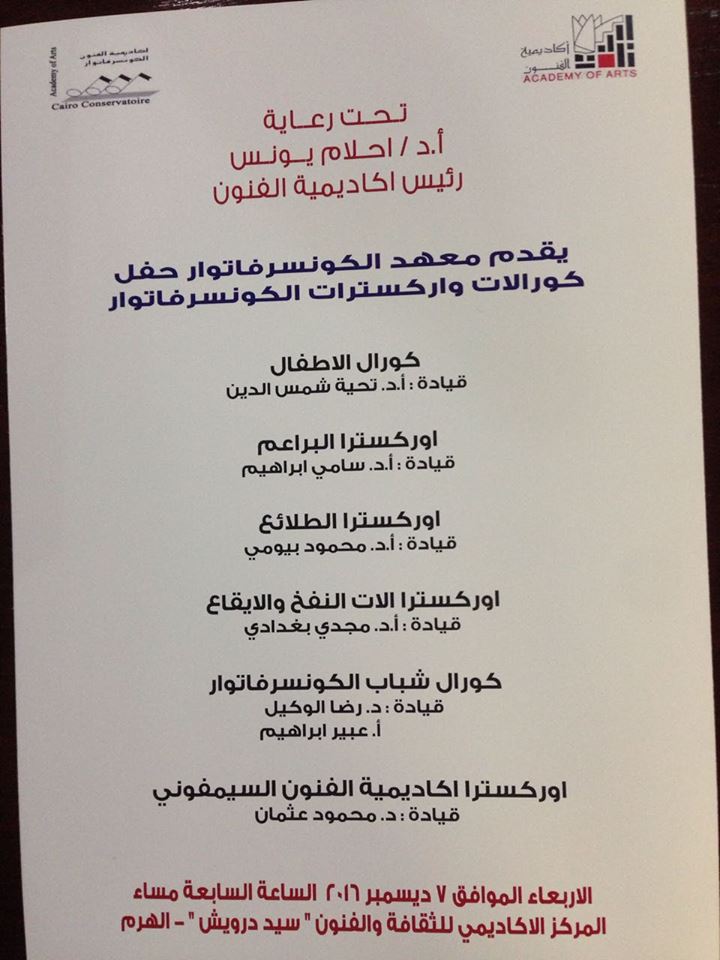 يقيم المعهد العالى للموسيقى (الكونسرفتوار) حفلا فنيا كبيرا (لكورالات وأوركسترات الكونسرفتوار) تحت رعاية الدكتورة أحـــــلام يونـــــس رئيس أكاديمية الفنون.