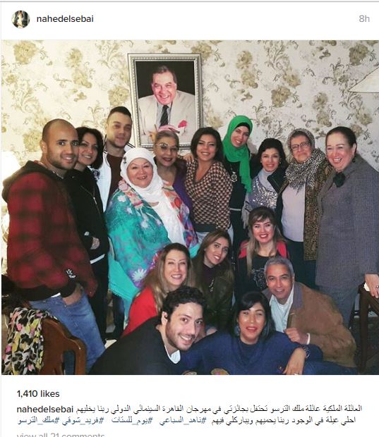 وعلقت "ناهد" على الصورة قائلة: "العائلة الملكية عائلة ملك الترسو تحتفل بجائزتي في مهرجان القاهرة السينمائي الدولي ربنا يخليهم احلي عيلة في الوجود ربنا يحميهم ويباركلي فيهم".