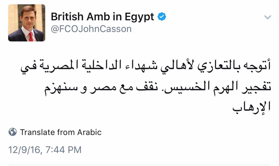 نعت السفارة البريطانية بالقاهرة ضحايا التفجير الذي وقع اليوم بالهرم وأسفر عن استشهاد 6 من رجل الشرطة، وذلك على صفحتها على موقع التواصل الاجتماعي "فيس بوك".