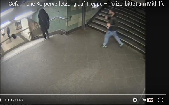 وأوضحت أن مقطع الفيديو الذي صورته إحدى كاميرات المراقبة بمحطة مترو في ضاحية "نيو كولن" بالعاصمة برلين، يظهر الرجل وهو يركل الفتاة ويرميها من أعلى السلم، ثم يغادر مسرح الجريمة بصحبة 3 شباب.