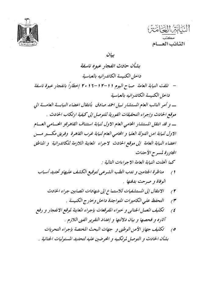 تلقت النيابة العامة صباح اليوم إخطارا بانفجار عبوة ناسفة داخل الكنيسة الكاتدرائية بالعباسية، وأمر النائب العام المستشار نبيل أحمد صادق بإنتقال أعضاء النيابة العامة إلى موقع الحادث وإجراء التحقيقات الفورية للتوصل إلى كيفية ارتكاب الحادث.