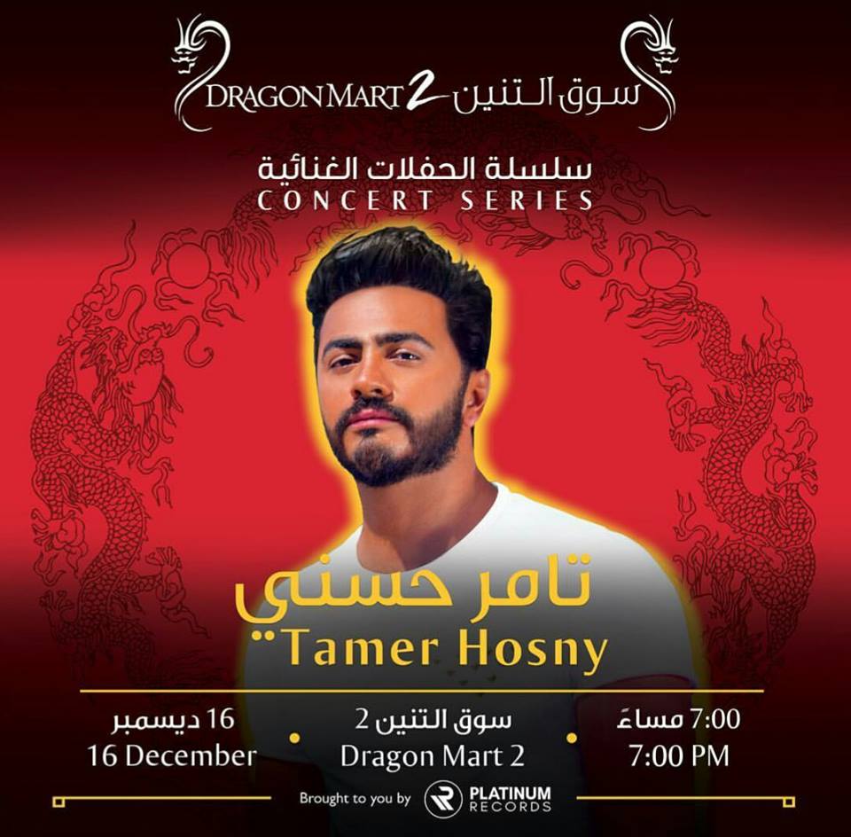 يستعد المطرب تامر حسني لإحياء حفل غنائي ساهر له بسوق التنين بمدينة دبي الإماراتية يوم 16 ديسمبر الجاري، في تمام السابعة مساء بتوقيت الإمارات، وذلك ضمن حفلات سوق التنين الشهير بالإمارات.كما يستعد تامر حسني لإحياء حفل رأس السنة الميلادية بأحد فنادق القاهرة، وذلك يوم السبت 31 ديسمبر الجاري، إذ ينتظر أن يقدم خلالها مجموعة من أروع أغانيه القديمة والحديثة، من بينها أغاني ألبومه الأخير "عمر ابتدا".