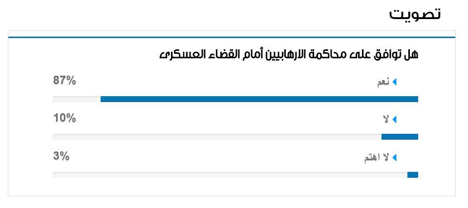 وجاءت نتيجة التصويت بموافقة 87% من قراء "صدى البلد" على محاكمة الإرهابيين أمام القضاء العسكري، فيما رفض 10% من القراء الأمر، وابدى 3% من القراء المشاركين فى الاستطلاع عدم اهتمامهم بالأمر.