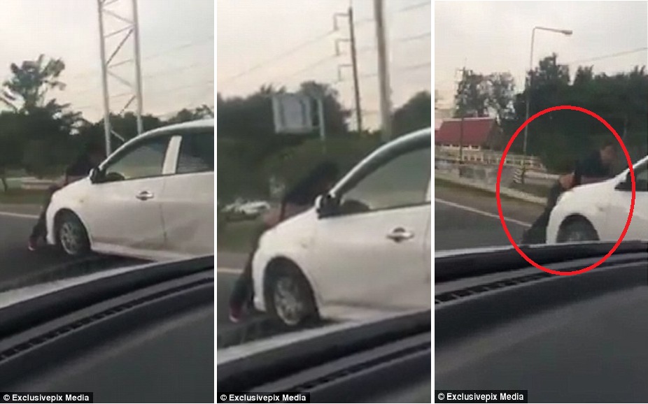 نشرت صحيفة "ديلي ميل" البريطانية، مقطع فيديو صادمًا يظهر زوجة غضبت من زوجها بعد مشاجرة نشبت بينهما، لتدفعه بالسيارة على طريق سريع فى تايلاند، وهو متمسك بالسيارة لأقصي درجة حتى لا يفقد حياته، حيث كانت تسير زوجته على سرعة 40 ميل فى الساعة.