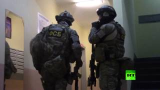 عرضت فضائية "روسيا اليوم"، مقطع فيديو لعملية اعتقال الأجهزة الأمنية الروسية، الخميس ، مجموعة إرهابية تضم 4 أشخاص كانوا يخططون لتنفيذ سلسلة من الأعمال الإرهابية في العاصمة الروسية موسكو.