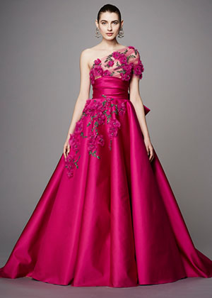 بعضها تألق أيضًا بطبعة الورود الملونة، وبعضها الآخر جاء مزدانًا بطبقات متعددة من الكشكش الذهبي المخرم، فيما تميزت فساتين أخرى بقصة الكتفين المنخفضتين أو الكمّين من التول الشفاف على شكل قصة الجرس.