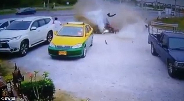 وحطمت السيارة المتهورة التاكسي وسيارة أخري دفع رباعي تصادف وجودهما بمكان مخصص للركن على جانب الطريق، فى مدينة "نونثابوري" التايلاندية بجوار أحد المطاعم على الطريق.