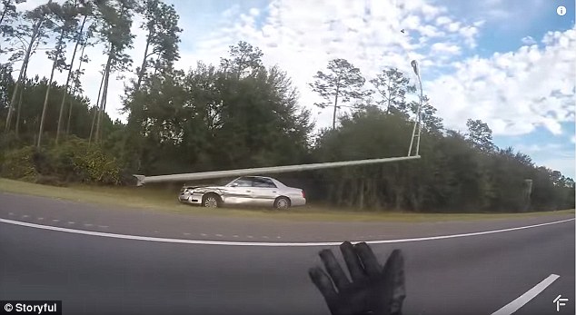 ووقع الحادث على أحد الطرق السريعة بولاية فلوريدا، وحاول الدراج كثيرًا الوصول لقائد السيارة واجتذابه منها، لكن دون جدوى، حتى توقفت السيارة وحدها.
