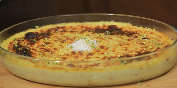 يوضع فى القالب او الصينية و يرش بالسكر و القرفه و المكسرات من اعلى ثم يدخل الفرن لمدة نصف ساعة ثم تترك لتهدأ حرارتها وتوضع في الثلاجة وتقدم باردة .