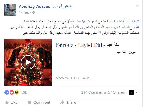 نشر أفيخاي أدرعي المتحدث باسم الجيش الإسرائيلي، أغنية "ليلة عيد" للنجمة اللبنانية فيروز على صفحته الرسمية بموقع "فيسبوك"، احتفالا بليلة عيد الميلاد المجيد.